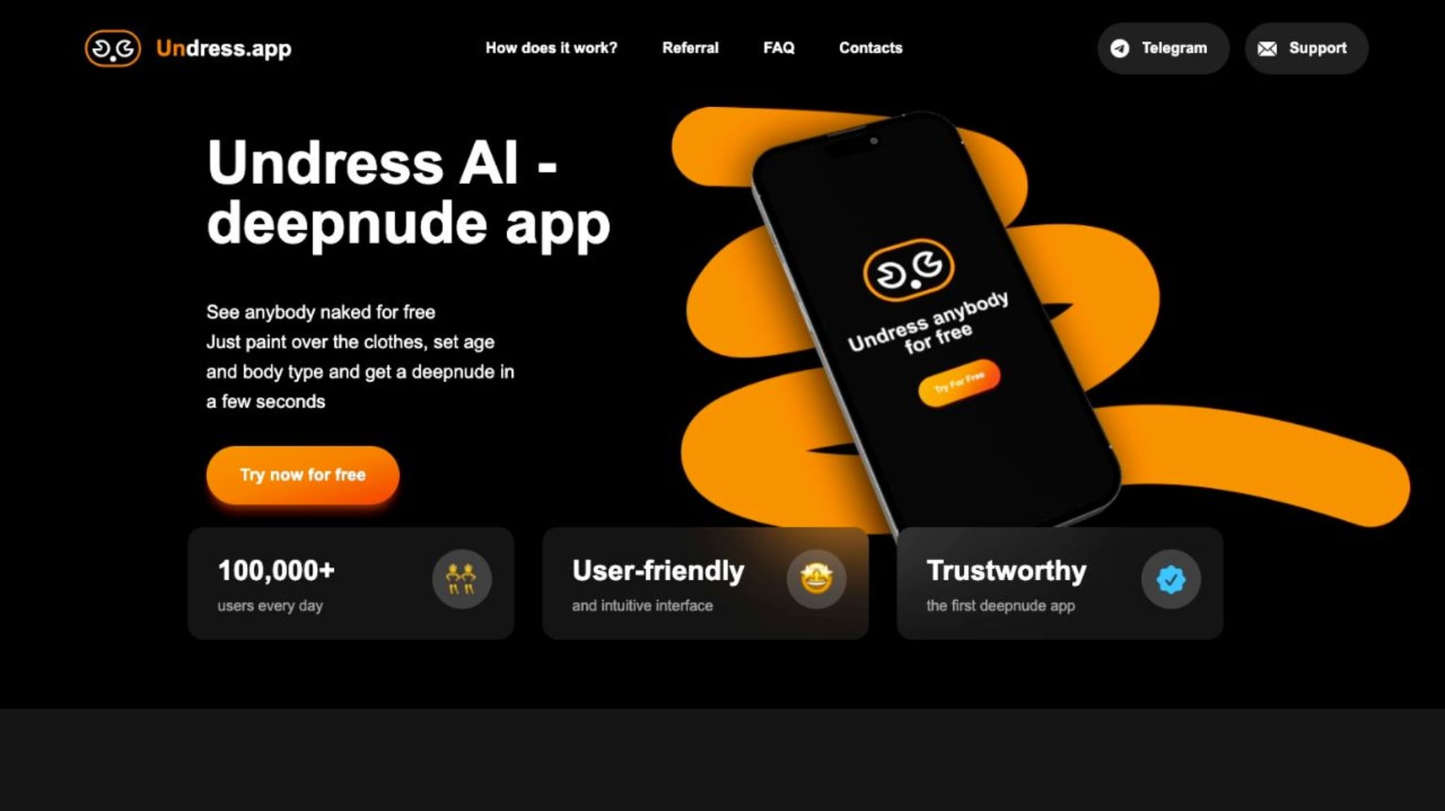 Undress VIP is the go-to AI deepnude bot for generating top-quality nudes. The tool generates realistic nudes for every image uploaded by the user and delivers the results on Telegram. It is one of the most popular deep-nude apps, with over 100,000 daily visitors. Users can also write text prompts to generate their desired nude or porn images in just a few seconds.